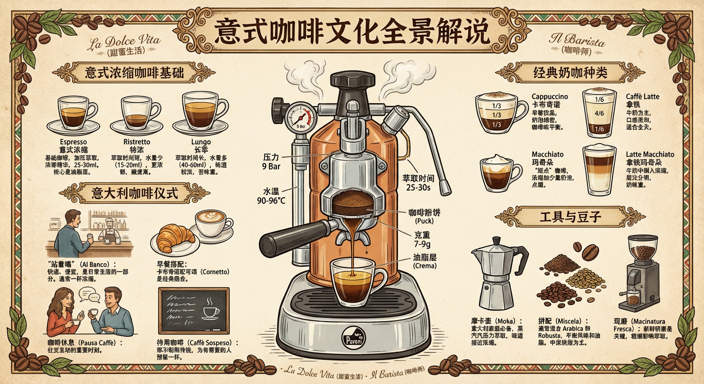 提示词:为我生成意式咖啡文化的详细解说图,配上详细的中文知识解析。