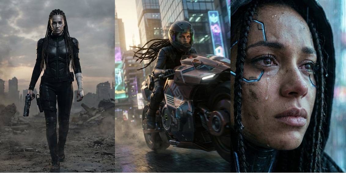 场景 B:骑摩托。戴头盔骑上摩托驰骋于霓虹未来城市的街道,中表现任务眼神坚毅;夕阳余晖,电影镜头感。
