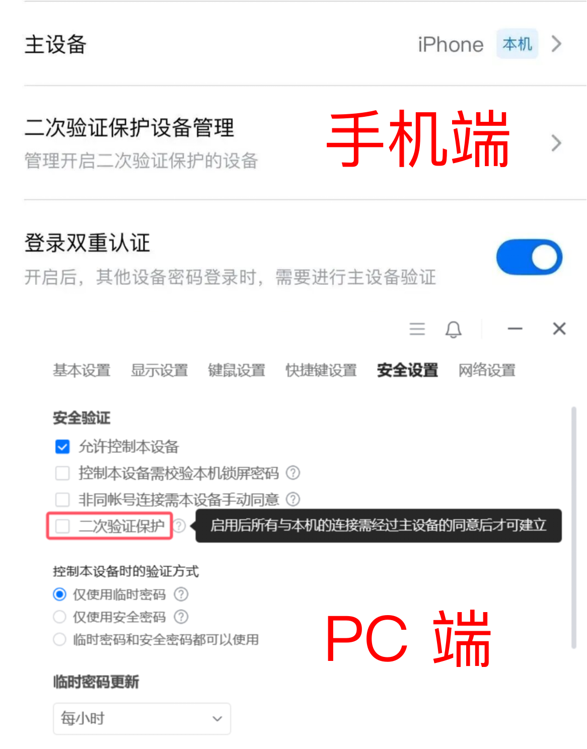 整体来看,ToDesk 防护功能的核心机制包括:【二次验证保护】【端到端加密】【反诈设计】。其中【二次验证保护】是 ToDesk 主打的安全功能,开启后,即使他人获得了你的设备代码和密码,也必须经过主设备点击同意,连接才能成功。这相当于为远程控制增加了一道“物理确认”的防线。而【端到端加密】的实际意义在于你的操作指令、传输文件等所有数据在离开你的设备前就已加密,直到到达目标设备才解密。理论上,包括 ToDesk 服务器在内的任何中间环节都无法查看你的数据内容。此外,【反诈设计】是指除了“新用户冷静期”,软件在连接过程中也会进行反诈风险评估和提示,这在国内远程控制软件中是比较有针对性的设计。