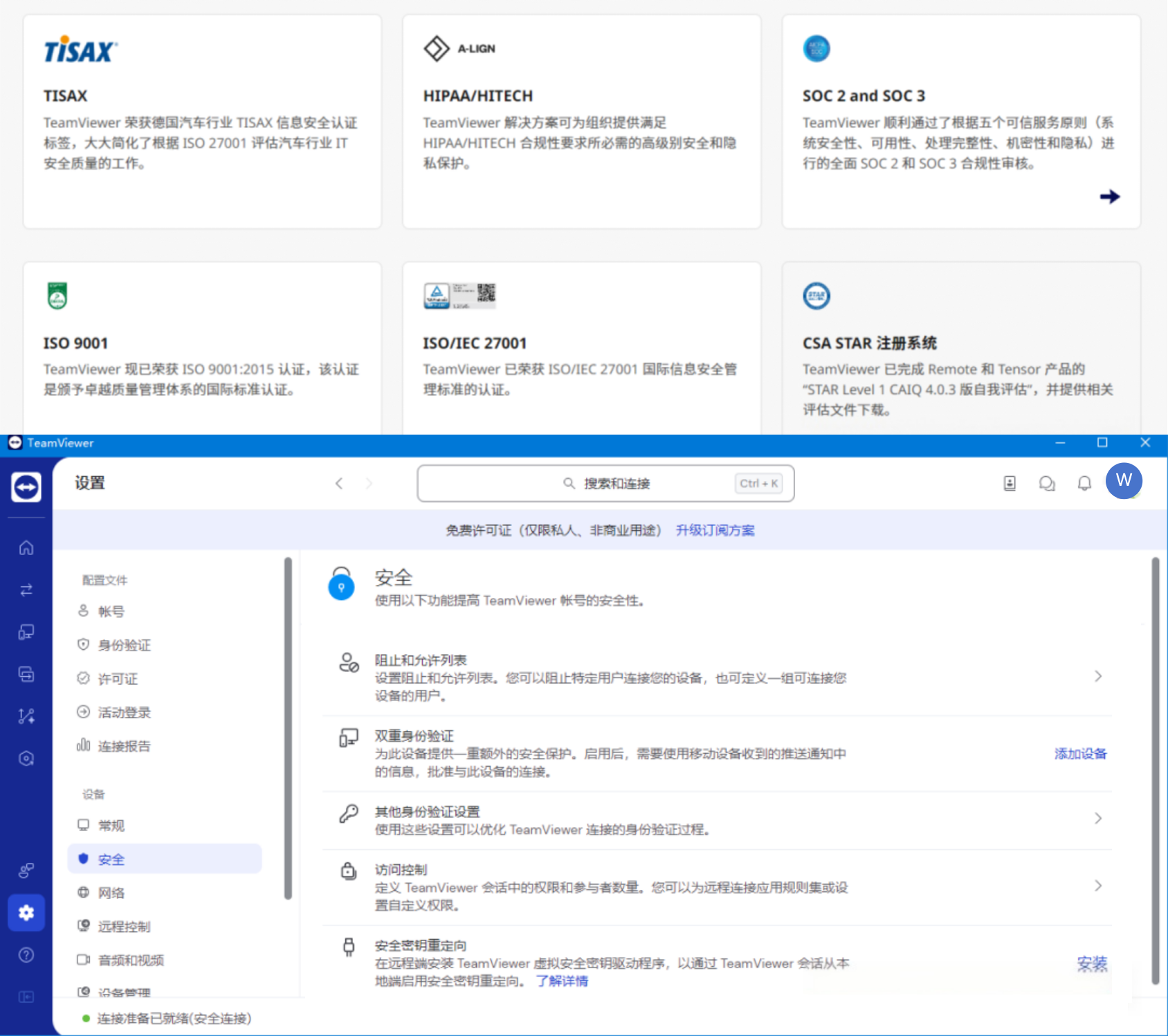 不可否认,作为全球老牌远程控制软件,TeamViewer 在安全技术和合规性上基础非常牢固。加密技术采用4096位 RSA 非对称加密进行密钥交换,并使用256位 AES 对称加密保护会话数据。这与银行和 HTTPS 网站使用的安全级别相当,意味着数据在传输过程中被第三方截获和破解的可能性极低。且在安全认证方面跟 Splashtop一样具备多个权威的第三方认证——包括 ISO 27001(信息安全管理)、SOC 2 Type II(安全运营审计)、GDPR、HIPAA,积极接受第三方审计。