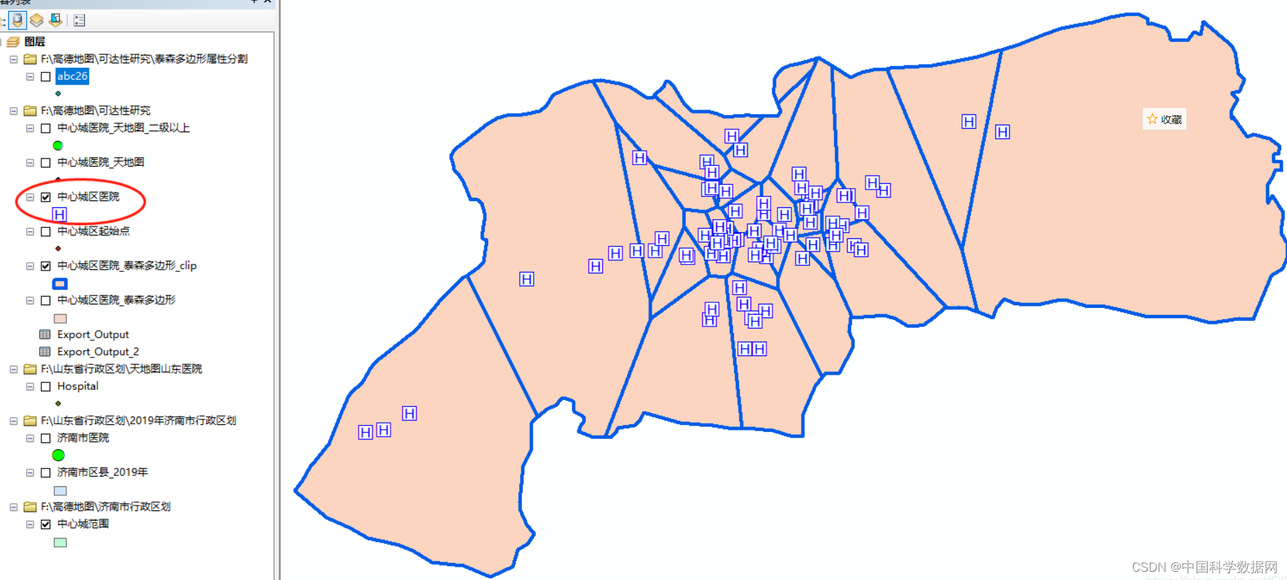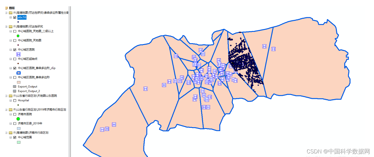 先来介绍一下开发背景:根据中心城区的医院数据(点)生成泰森多边形——(图1),然后利用arctoolbox工具箱中的提取分析-分割工具对刚刚创建的泰森多边形进行属性分割,共得到28个多边形。现在利用每个多边形对其包含的兴趣点(本文指的是中心城区起始点.shp)图2进行裁剪,想到的方法就是arcpy。