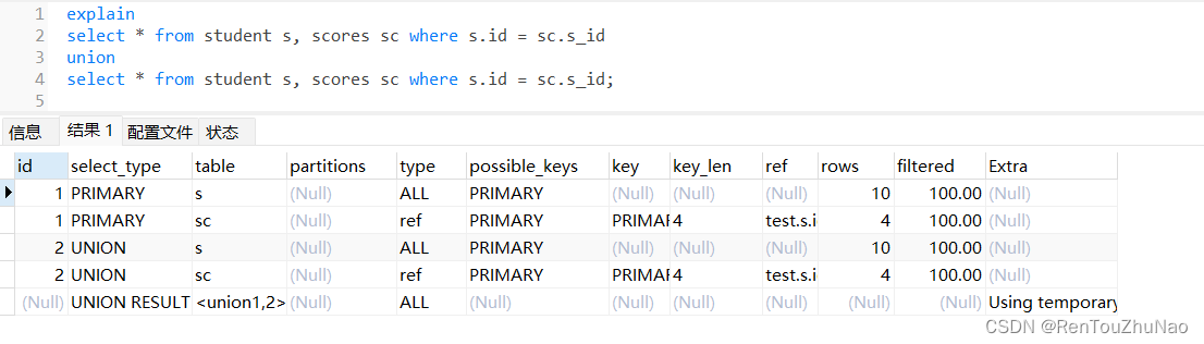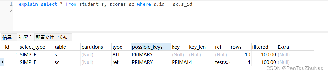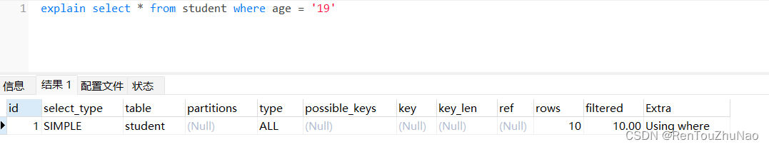| 10 | rows | 根据表统计信息及索引选用情况,大致估算出找到所需的记录所需读取的行数 filtered //查询的表行占表的百分比 |
