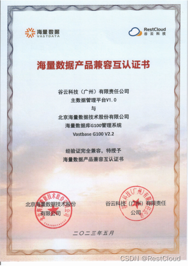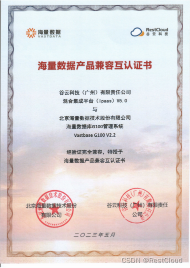 近日,谷云科技(广州)有限责任公司(以下简称“谷云科技”)的混合集成平台(ipaas)、全域数据交换平台、主数据管理平台与北京海量数据技术股份有限公司(以下简称“海量数据”)的海量数据库G100管理系统完成产品兼容性互认证。测试结果显示:双方产品兼容性良好,系统功能运行稳定,能够满足数据安全性以及关键性能要求。