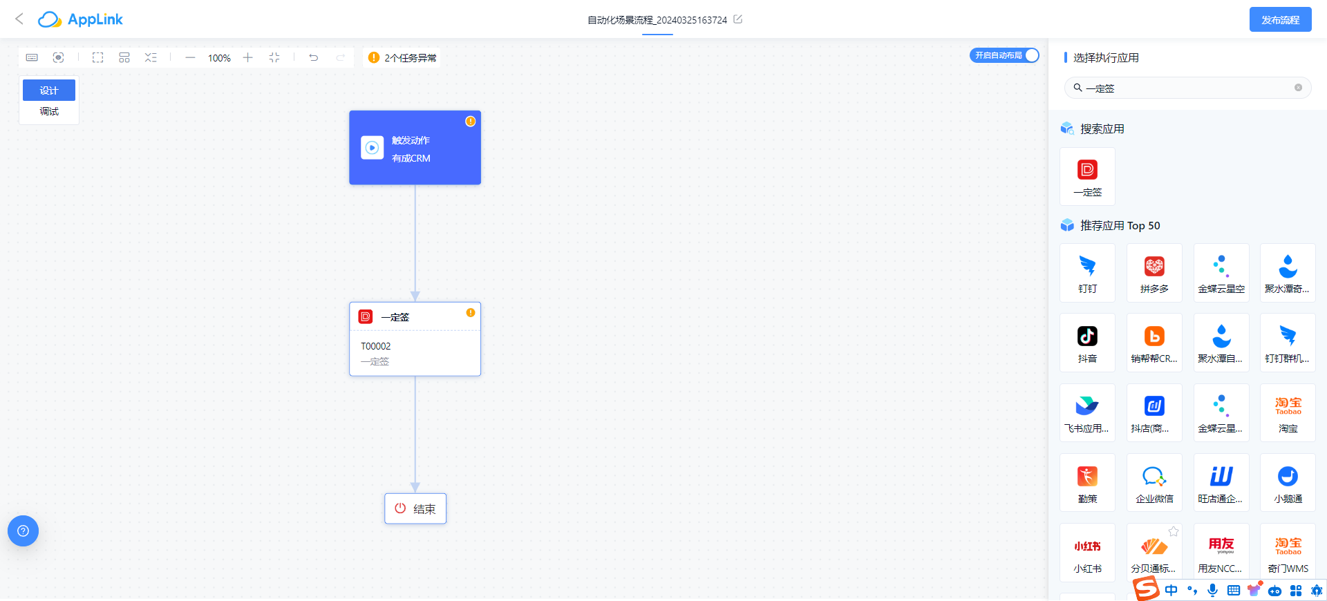 3.进入流程后,依次将相关对应的动作找出后拖入画布中,打开节点配置选择对应的选项以及填写对应的信息内容,具体动作顺序如下:触发动作【所需的CRM系统】--执行动作【一定签-上传合同并发起签署】