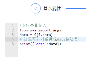 如图所示,该python脚本从库表输入节点获取到data数据流;可以根据python语法按需对数据流数组对象data[{“a”:123, “b”:123}…]对象进行处理。