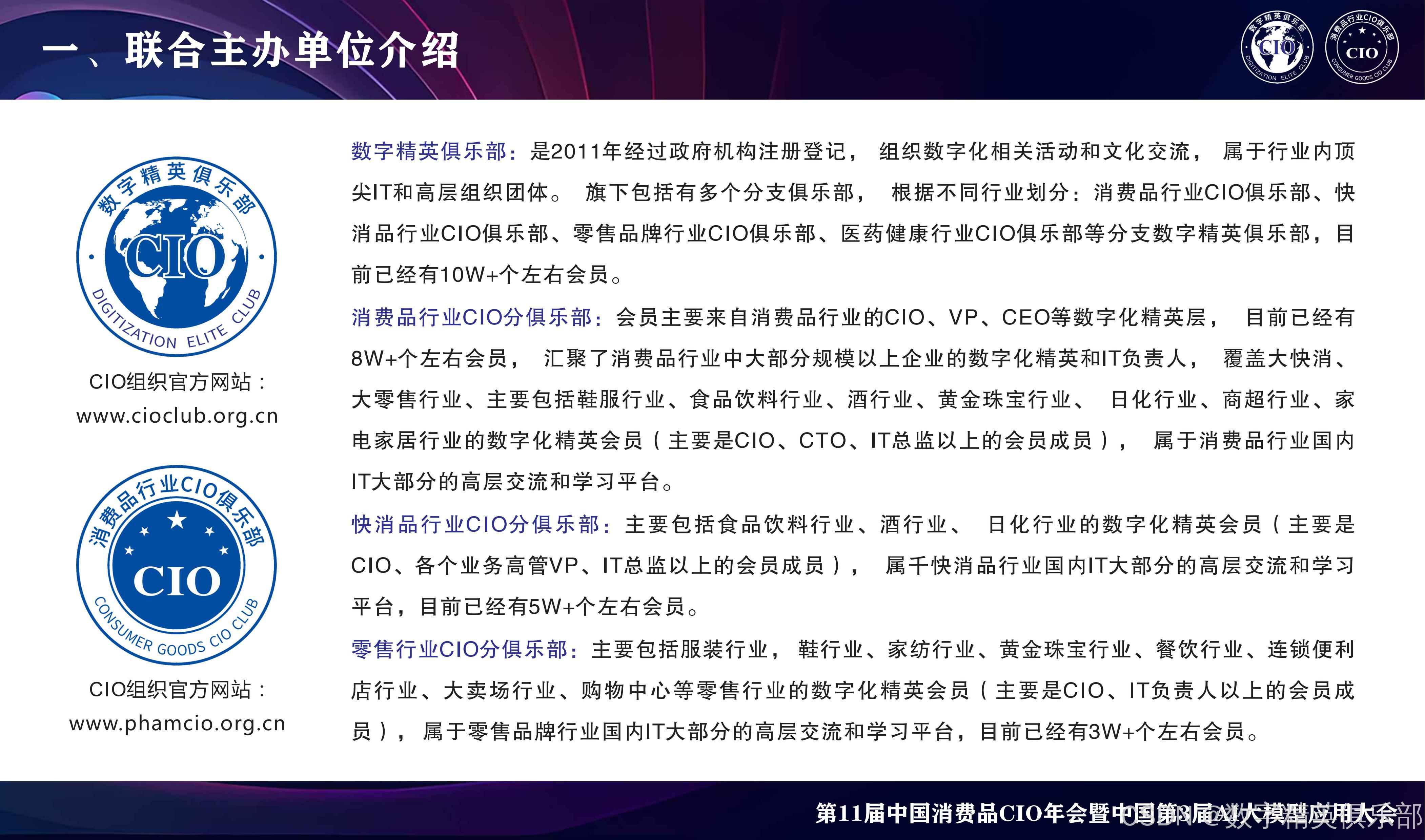 主办方介绍:数字精英俱乐部,是2011年经过政府机构注册登记,组织数字化相关活动和文化交流,属于行业内顶尖IT和高层组织团体。旗下包括有多个分支俱乐部,根据不同行业划分:消费品行业CIO俱乐部、医药医疗行业CIO俱乐部、新能源行业CIO俱乐部、装备制造行业CIO俱乐部等分支数字精英俱乐部,目前已经有10W+个左右会员。