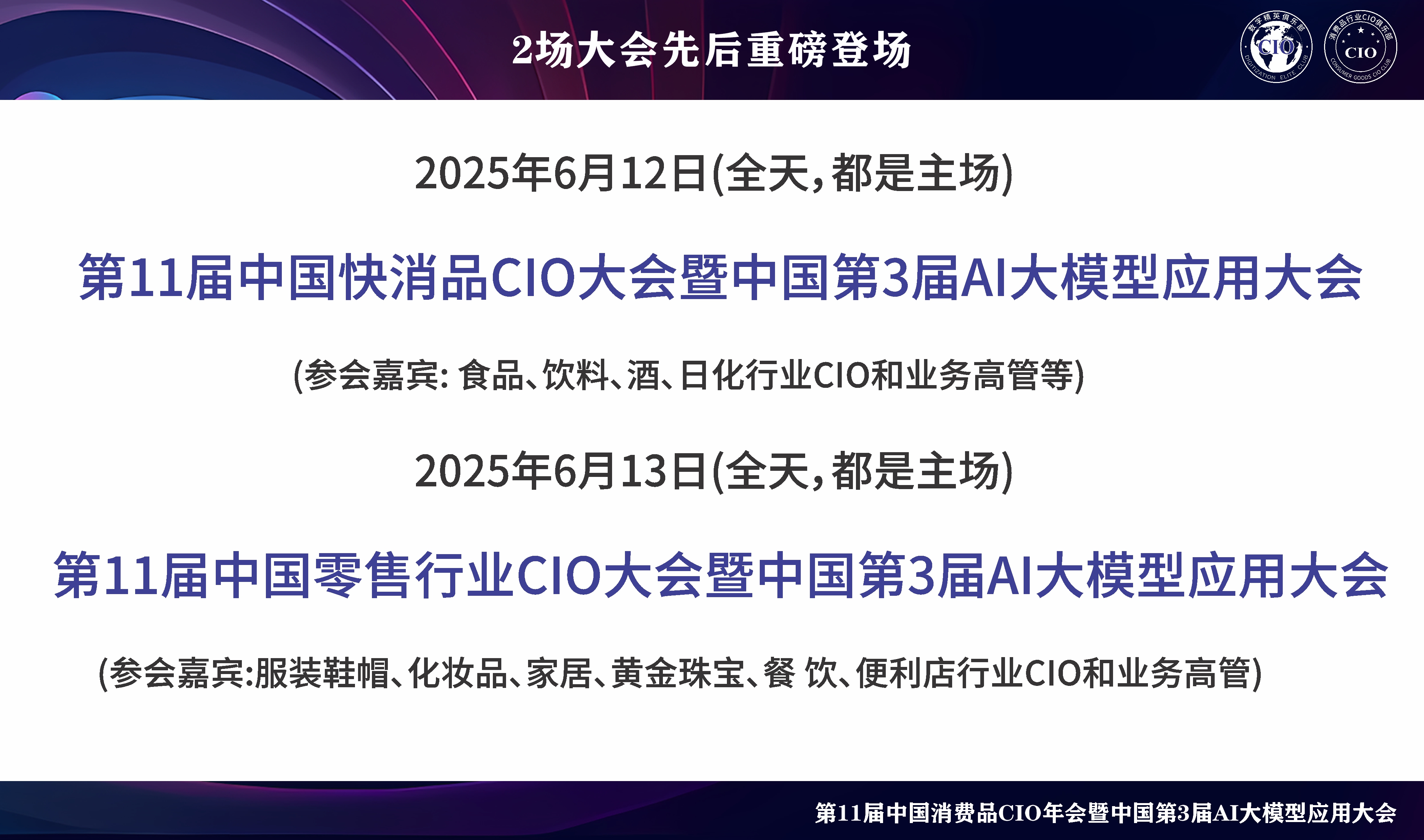 第11届中国消费品CIO大会暨第3届中国AI大模型应用大会,相约2025年6月11日-12日在上海召开,以“创新 跨越 融合”为主题,将邀请600+CIO嘉宾、优质信息科技展商、行业知名媒体,百位头部CIO同台发言,现场将展示大量极具创新力的产品、优秀案例、技术、解决方案等,力求推动行业创新发展,展望消费品企业数字化未来。