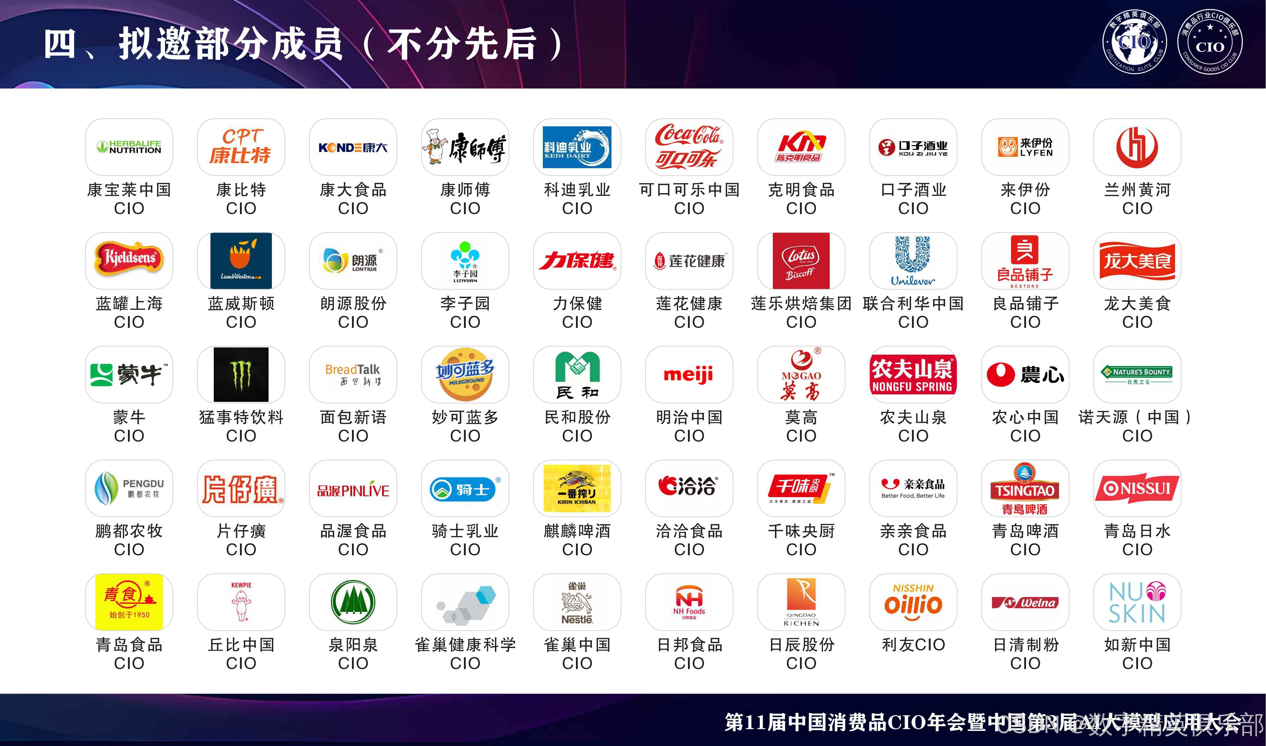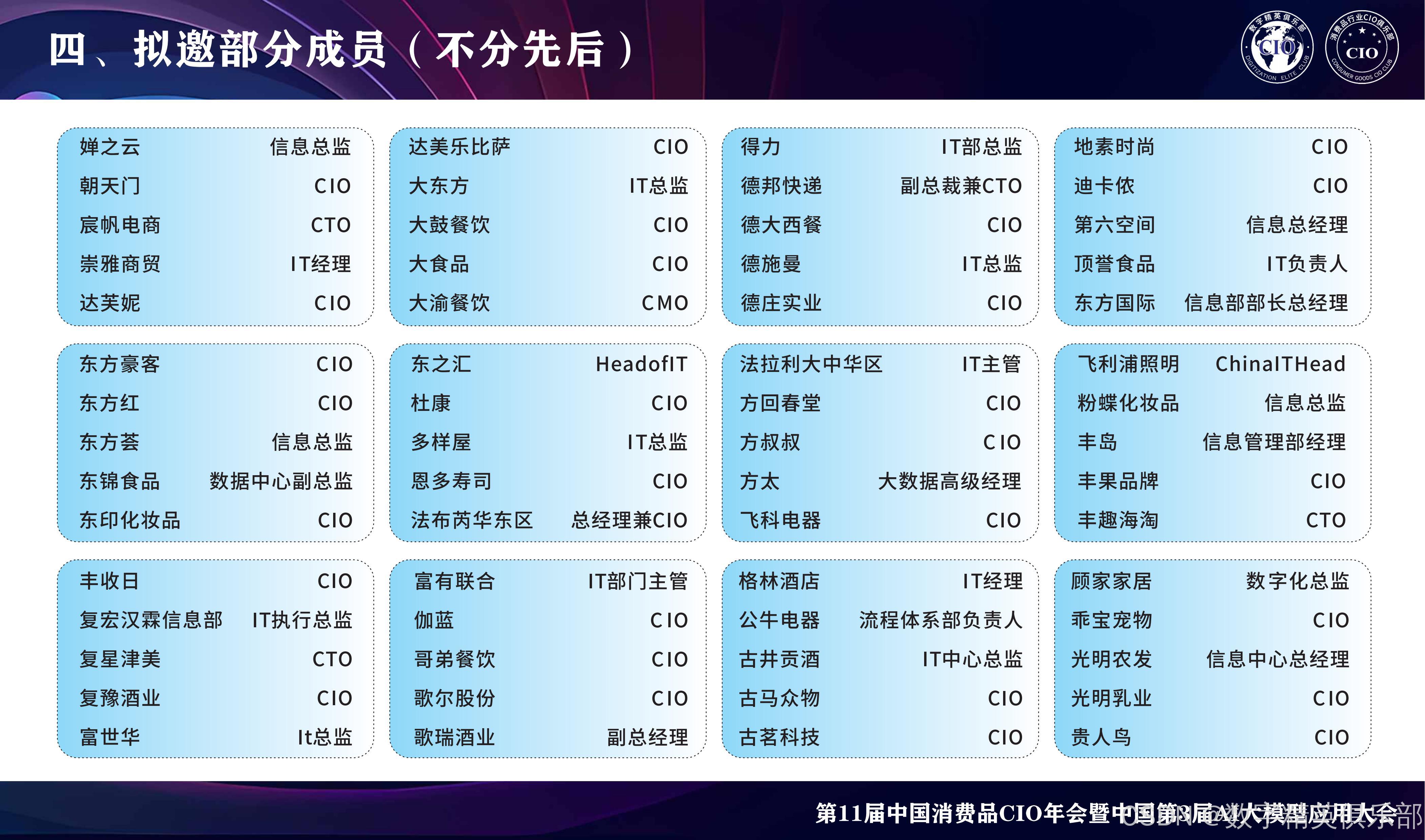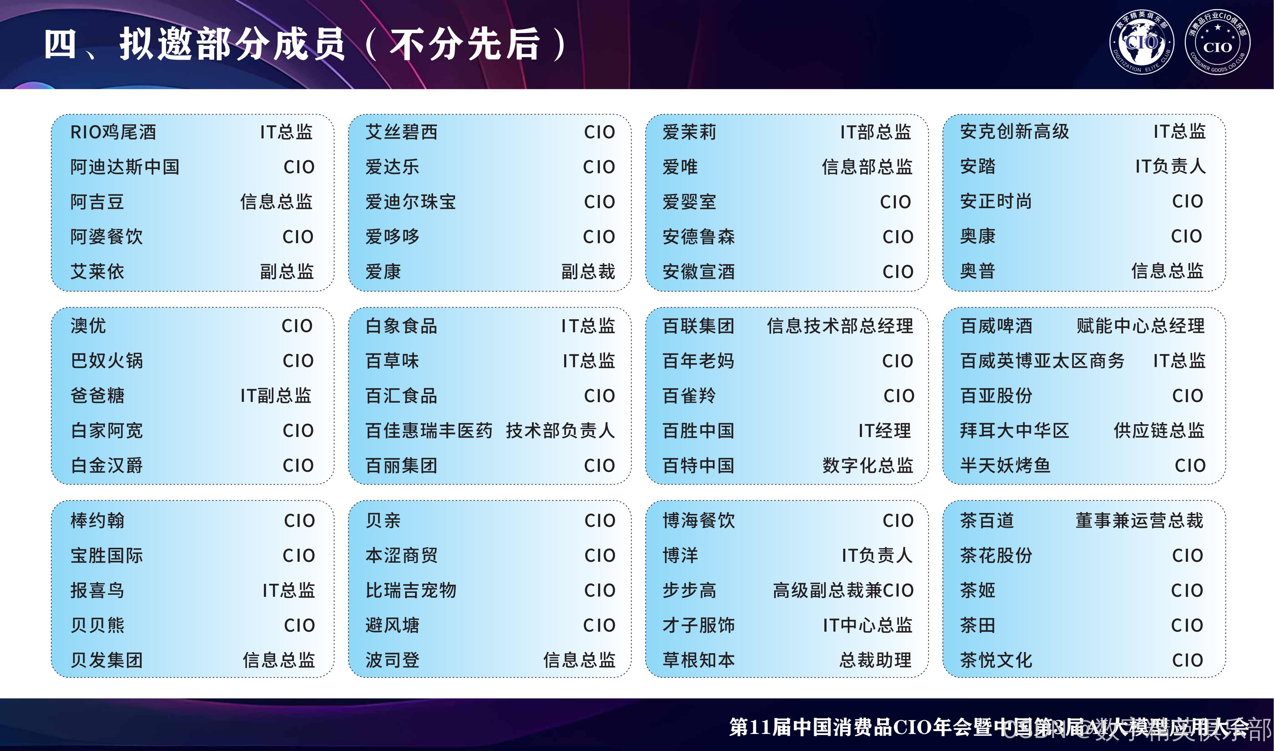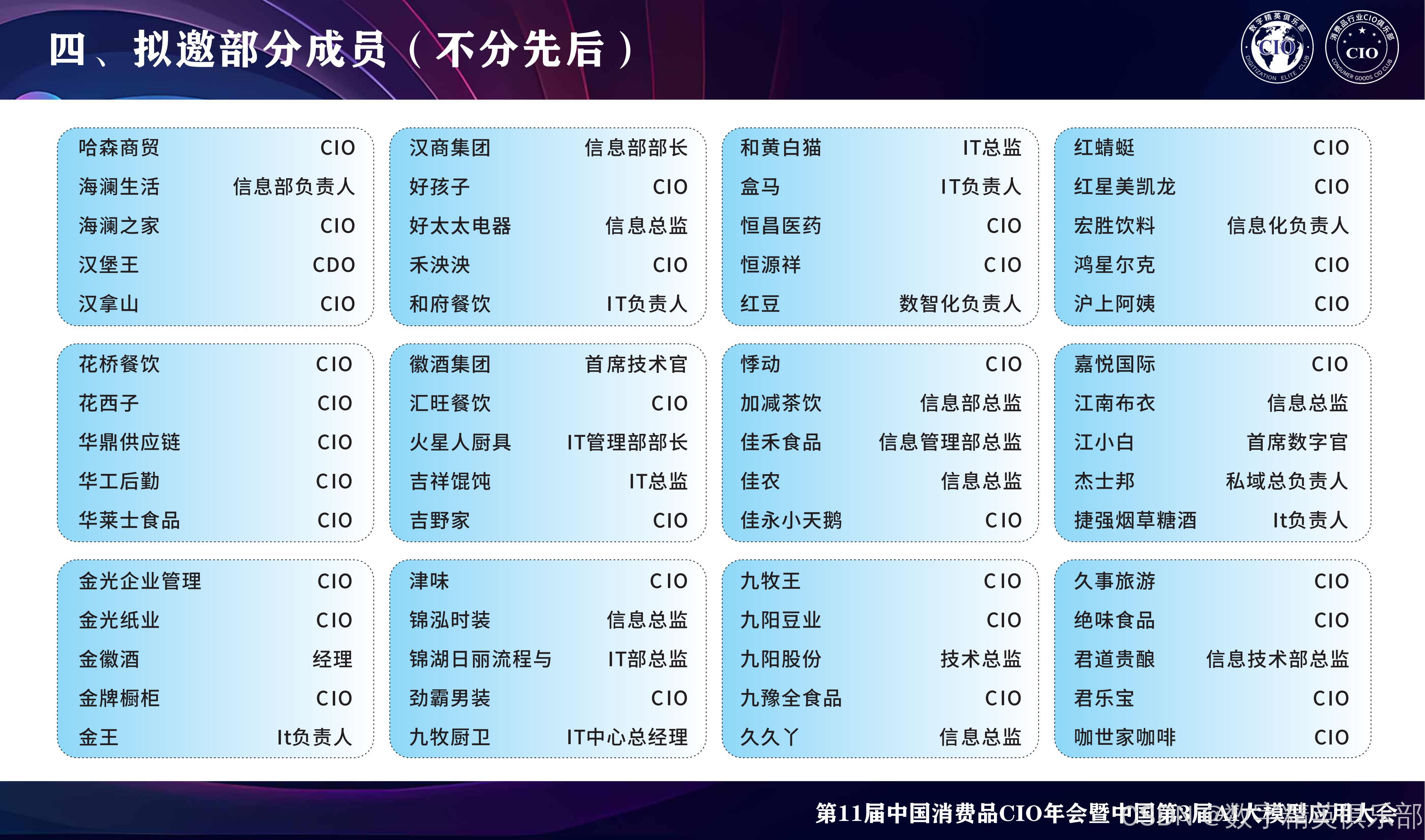 消费品行业CIO俱乐部:会员主要来自消费品行业的CIO、VP、CEO等数字化精英层,目前已经有8W+个左右会员,汇聚了消费品行业中大部分规模以上企业的数字化精英和IT负责人,覆盖大快消、大零售行业、主要包括鞋服行业、食品饮料行业、酒行业、黄金珠宝行业、日化行业、商超行业、家电家居行业的数字化精英会员(主要是CIO、CTO、IT总监以上的会员成员),属于消费品行业国内IT大部分的高层交流和学习平台。
