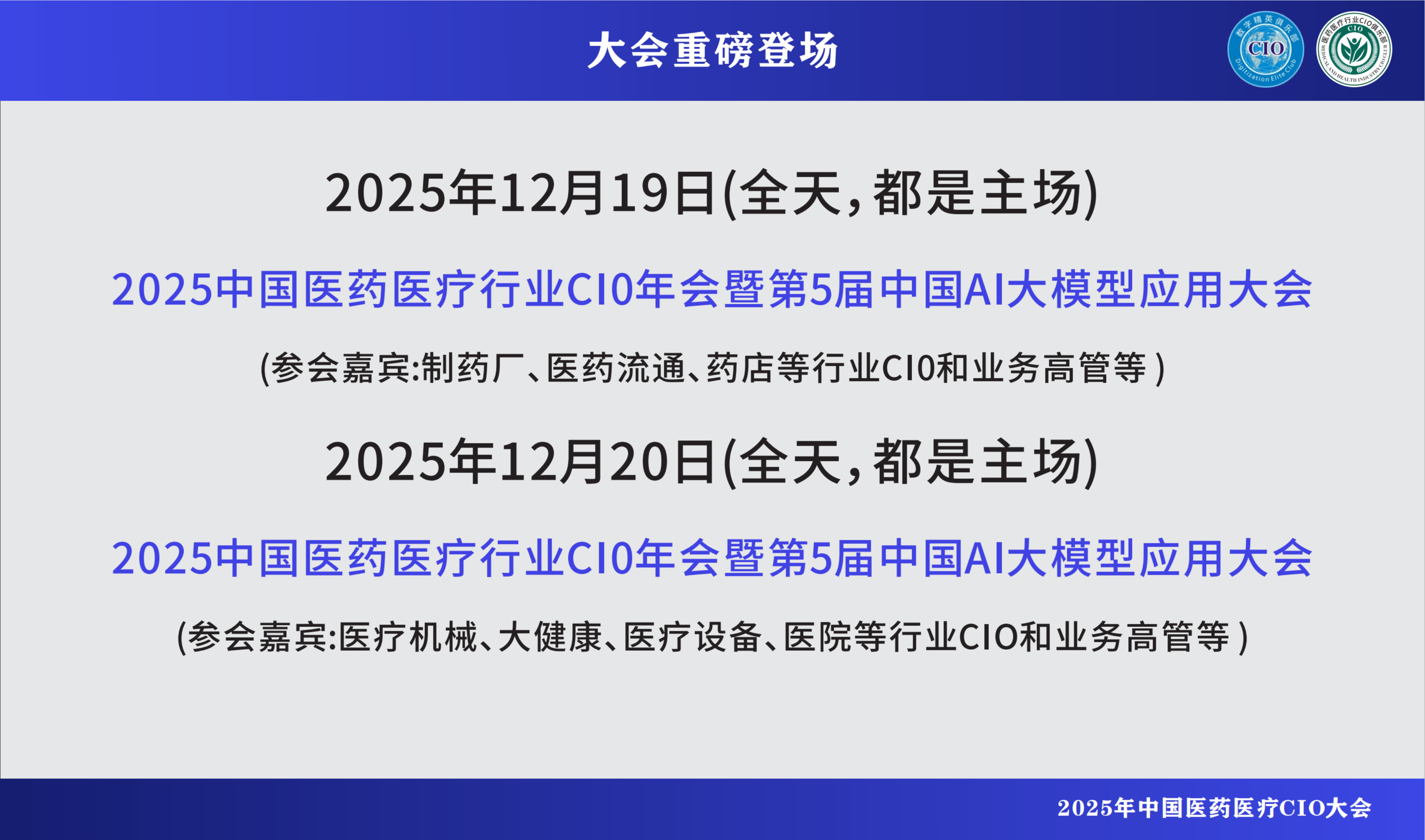 2025中国医药医疗行业CIO年会暨第5届中国医疗AI大模型应用大会,相约2025年12月19日-20日在上海召开,以“赋能 转型 创新”为主题,将邀请600+CIO嘉宾、优质信息科技展商、行业知名媒体,百位头部CIO同台发言,现场将展示大量极具创新力的产品、优秀案例、技术、解决方案等,力求推动行业创新发展,展望医药医疗企业数字化未来