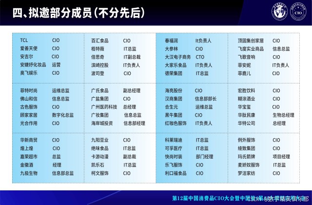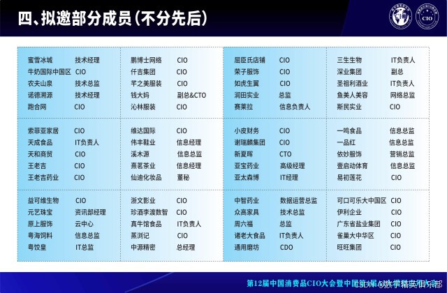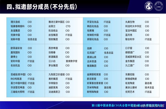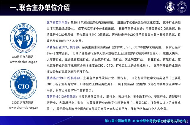 消费品行业CIO俱乐部:会员主要来自消费品行业的CIO、VP、CEO等数字化精英层,目前已经有10W+个左右会员,汇聚了消费品行业中大部分规模以上企业的数字化精英和IT负责人,覆盖大快消、大零售行业、主要包括鞋服行业、食品饮料行业、酒行业、黄金珠宝行业、日化行业、商超行业、家电家居行业的数字化精英会员(主要是CIO、CTO、IT总监以上的会员成员),属于消费品行业国内IT大部分的高层交流和学习平台。