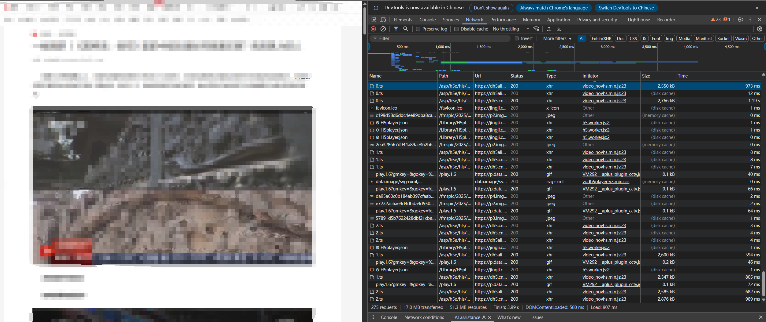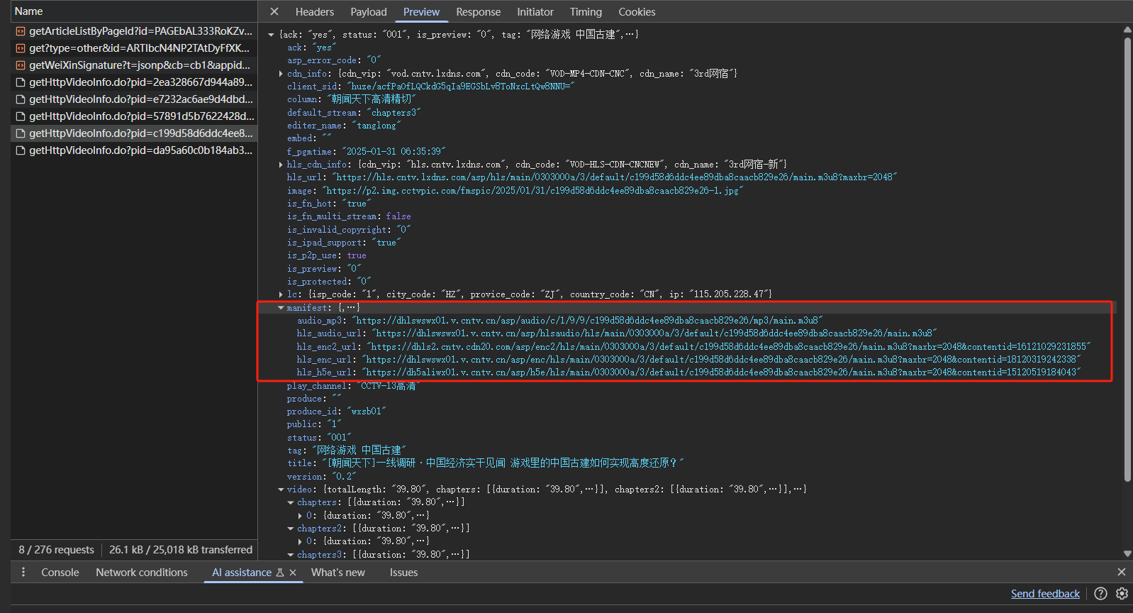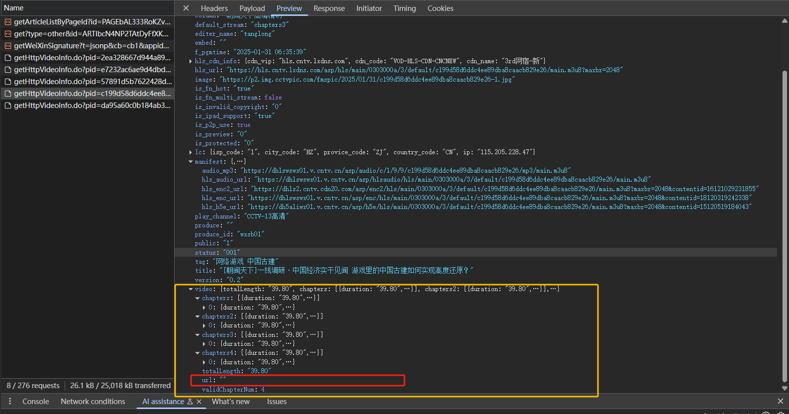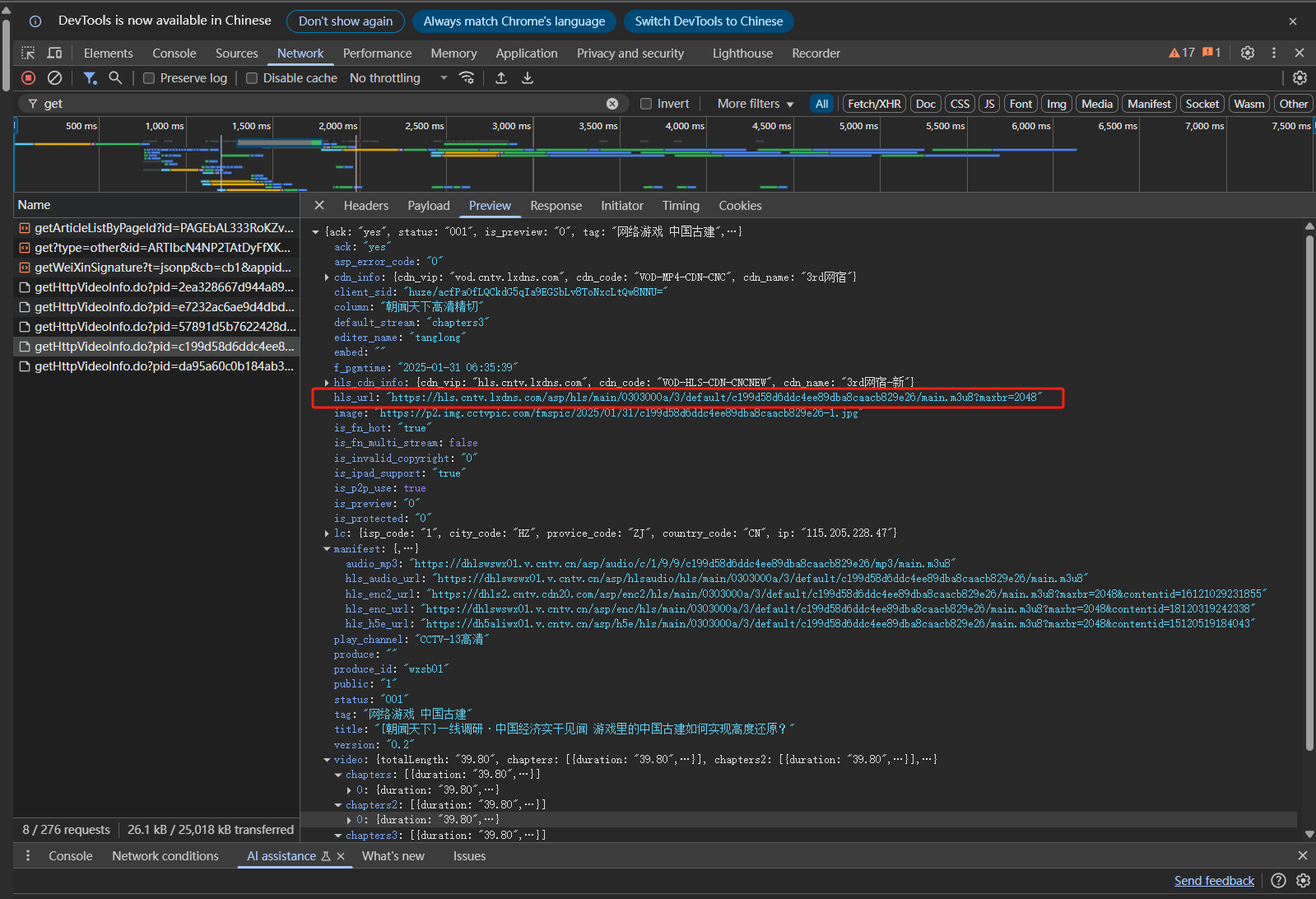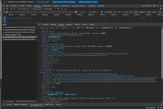 2、选择“Network”,搜索筛选”getHttp”,找到对应视频的getHttpVideoInfo.do文件的响应结果,在Preview中可以看到视频信息的hls_url地址,复制该地址新标签页打开,下载.m3u8文件。