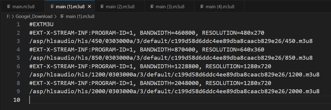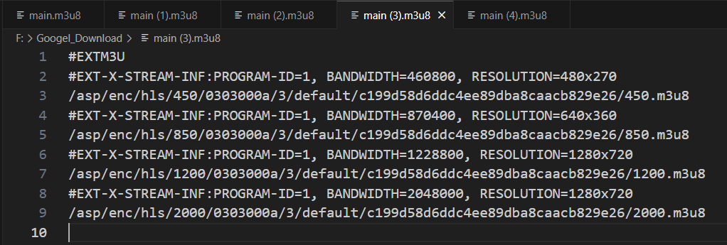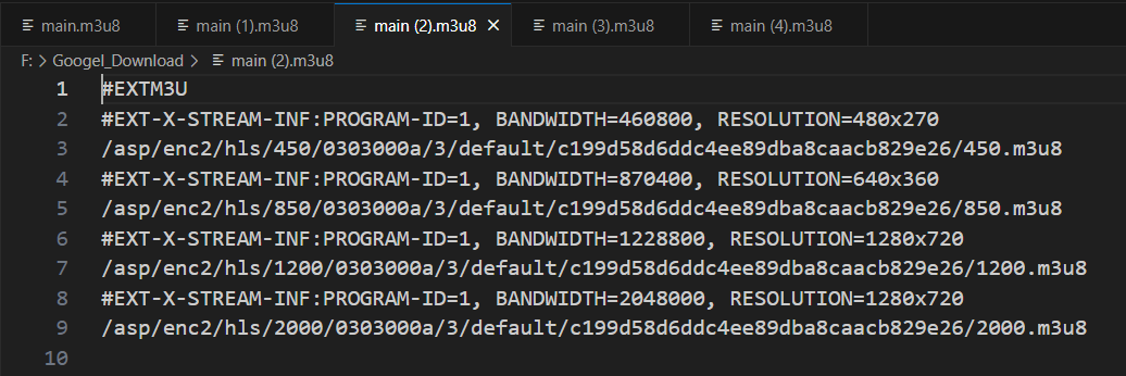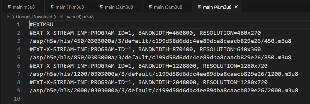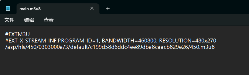 3、打开下载的.m3u8文件,可以看到该视频规格下真实的视频地址信息:“/asp/hls/450/0303000a/3/default/c199d58d6ddc4ee89dba8caacb829e26/450.m3u8”