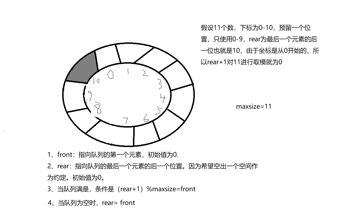 队列满的条件是(rear+1)%maxSize == front (如下图所示)