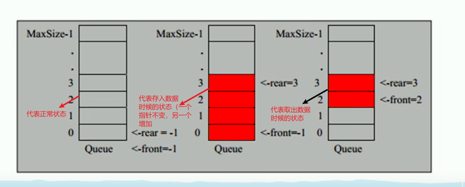 当rear<front时,此时队列的长度为分为两段,一段是maxSize - front,另一段是0+rear,