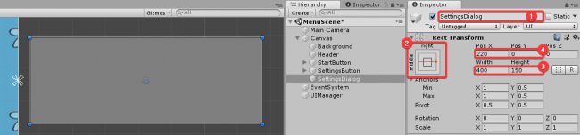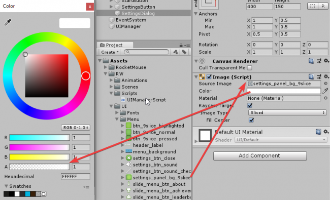 选择Hierarchy中的SettingsDialog,并将settings_panel_bg_9slice拖到 " Inspector"中的 "Source Image "字段。双击 "Source Image"字段旁边的 "Color ",并将A设置为255(或1,取决于你的颜色选择器设置),以去除透明度。
