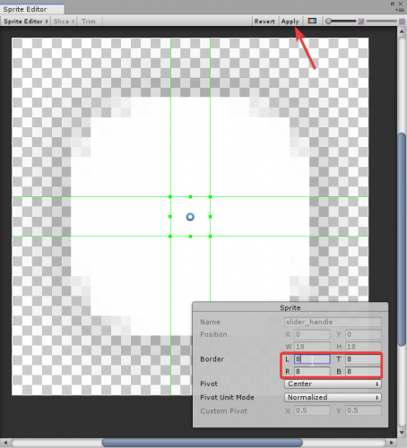 对于每张图片,在 "Inspector"中打开Sprite编辑器,并将Border的所有值设置为8。单击 "Apply"