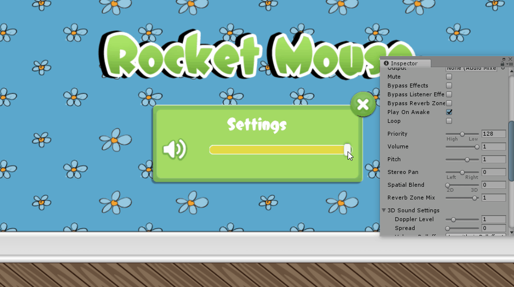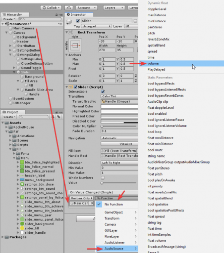 此外,将滑块组件的值设置为 1,这样就会在场景开始时将滑块设置为与音乐音量相同的值。