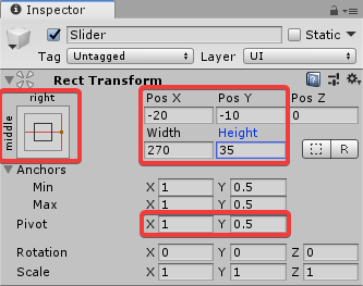 在 "Hierarchy"中选择VolumeSlider,并将其锚点设置为右中。然后设置它的Pivot为(1, 0.5),这样你就可以用它右边缘的中间点来定位。