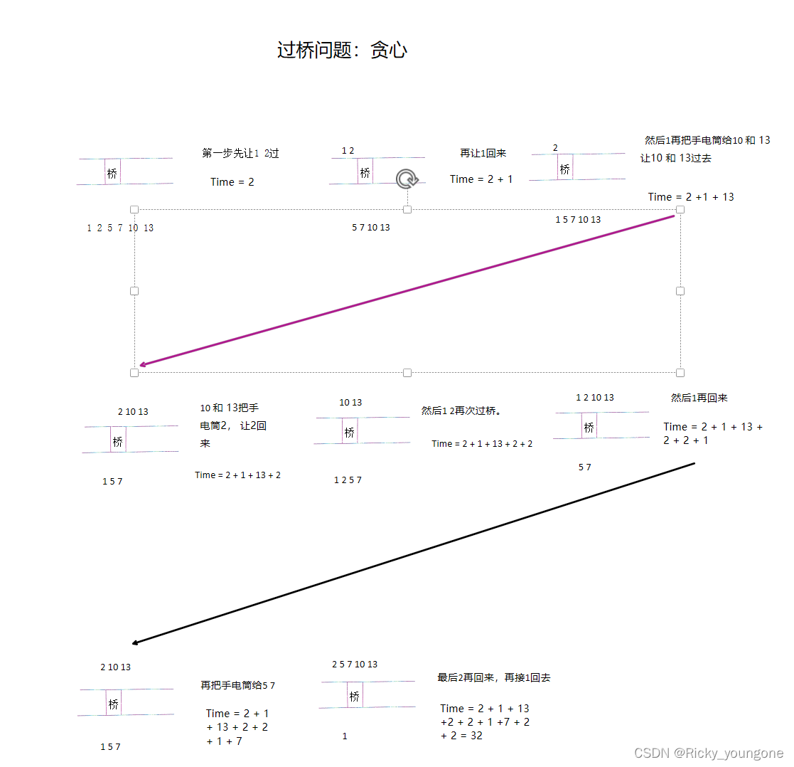 有n个人希望在晚上通过一座桥。在任何时刻,最多只能有两个人在桥上,并且必须要带着手电筒才能通过桥。现在的麻烦是只有一个手电筒,所以必须安排某种顺序,使得手电筒可以被带回去让更多的人过桥(手电筒必须由人带回,不可以从对岸扔过去)。 每个人都有不同的过桥时间,两个人一起过桥所用的时间等于其中较慢的一个。你的任务是要找出能在最短时间内使所有人都过桥的方案。