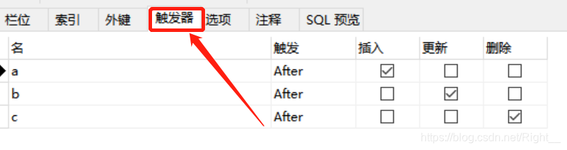 名字是由自己起的,触发有两种选择 (After和Before),表示在此操作之前或者之后触发该触发器,然后选择是那种操作会触发该触发器。