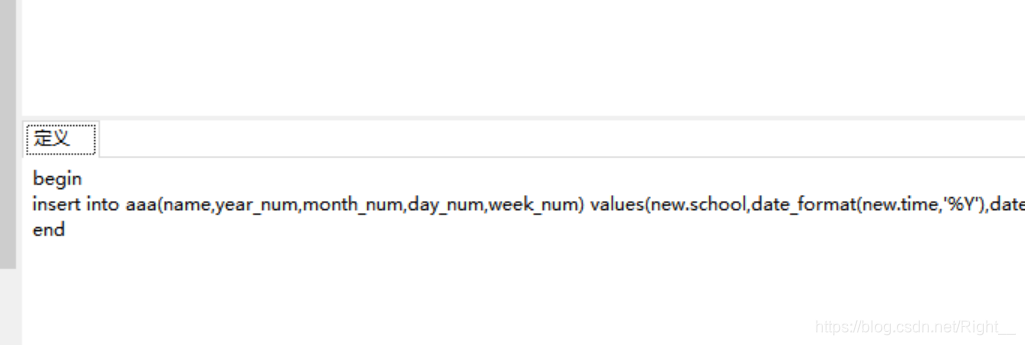 中间写触发的sql语句,我写的触发器是当bbb表插入一条数据时,bbb表中的school字段插入aaa表中的name字段值,还把bbb表中的time字段分割为年、月、日、今年的第几周存入aaa表中