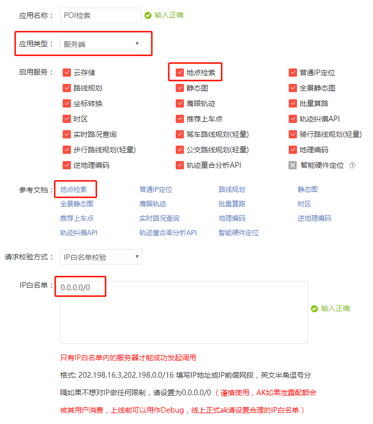 然后,输入应用名称,应用类型选择服务端,把地点检索给勾选上。参考文档可以看具体的API调用方法。