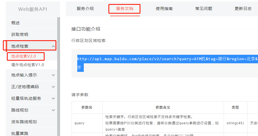 选择地点检索V2.0的服务文档,我们会看到使用说明: