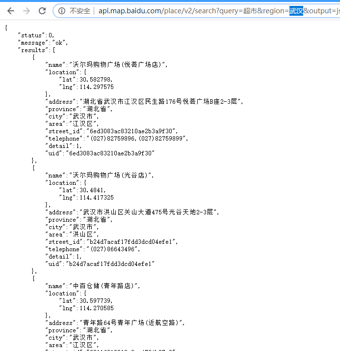 其实就是通过一个编辑好的URL,请求数据,然后服务器返回相应的信息。比如使用行政区划区域检索武汉市内的超市信息,则可以编辑: