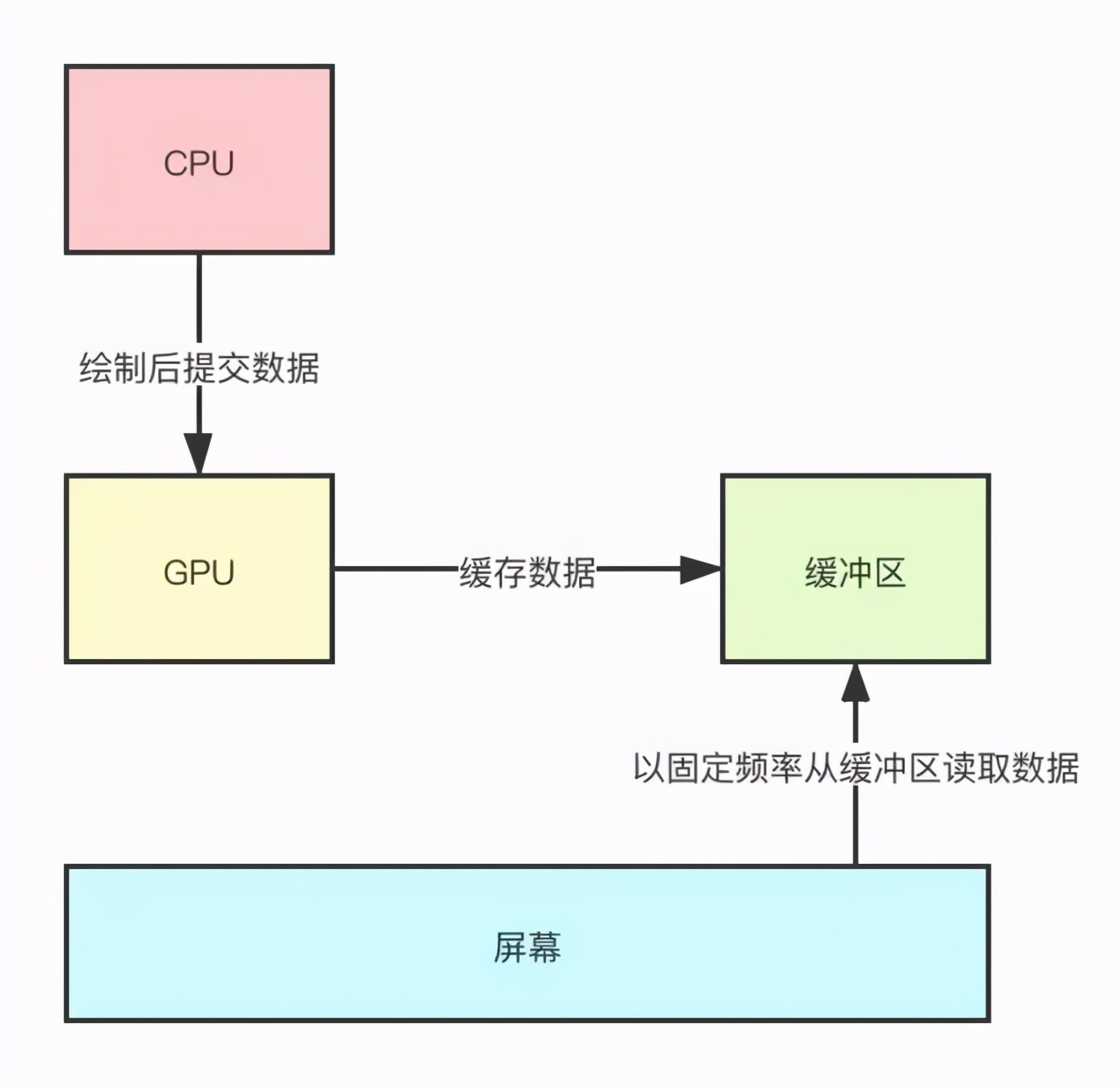 总结一句话就是:CPU 绘制后提交数据、GPU 进一步处理和缓存数据、最后屏幕从缓冲区中读取数据并显示。