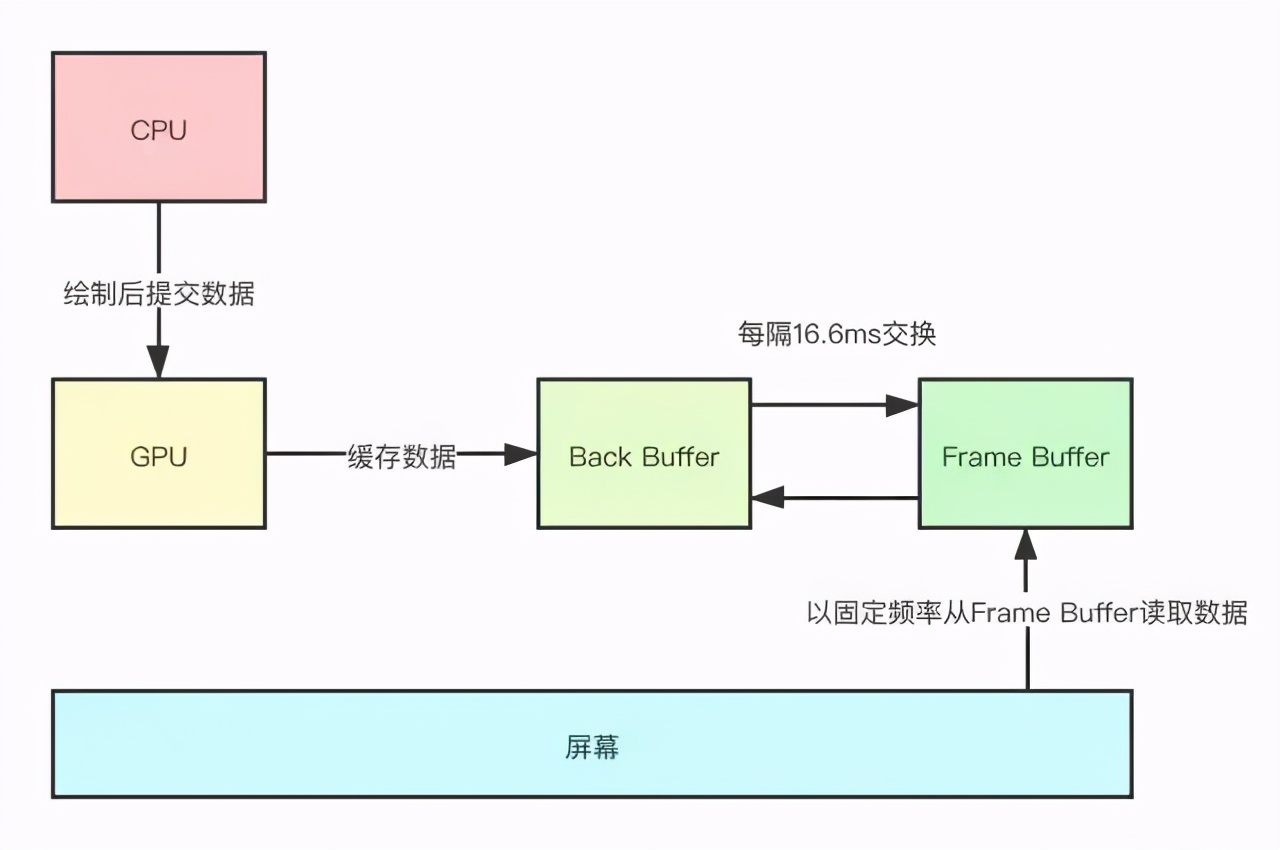 GPU只向Back Buffer中写入绘制数据,且GPU会定期交换Back Buffer和Frame Buffer,交换的频率也是60次/秒,这就与屏幕的刷新频率保持了同步。