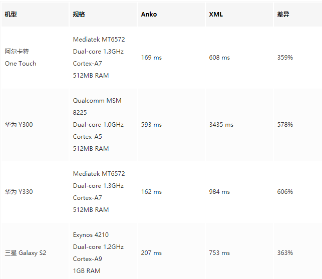 同时,它去除了IO与反射过程,性能更好,以下是Anko与XML的性能对比。
