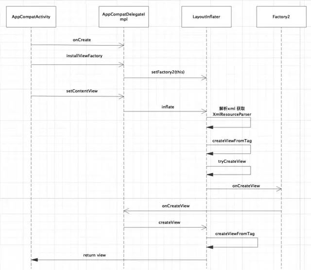 在真正进行反射实例化xml结点前,会调用mFactory2的onCreateView方法。