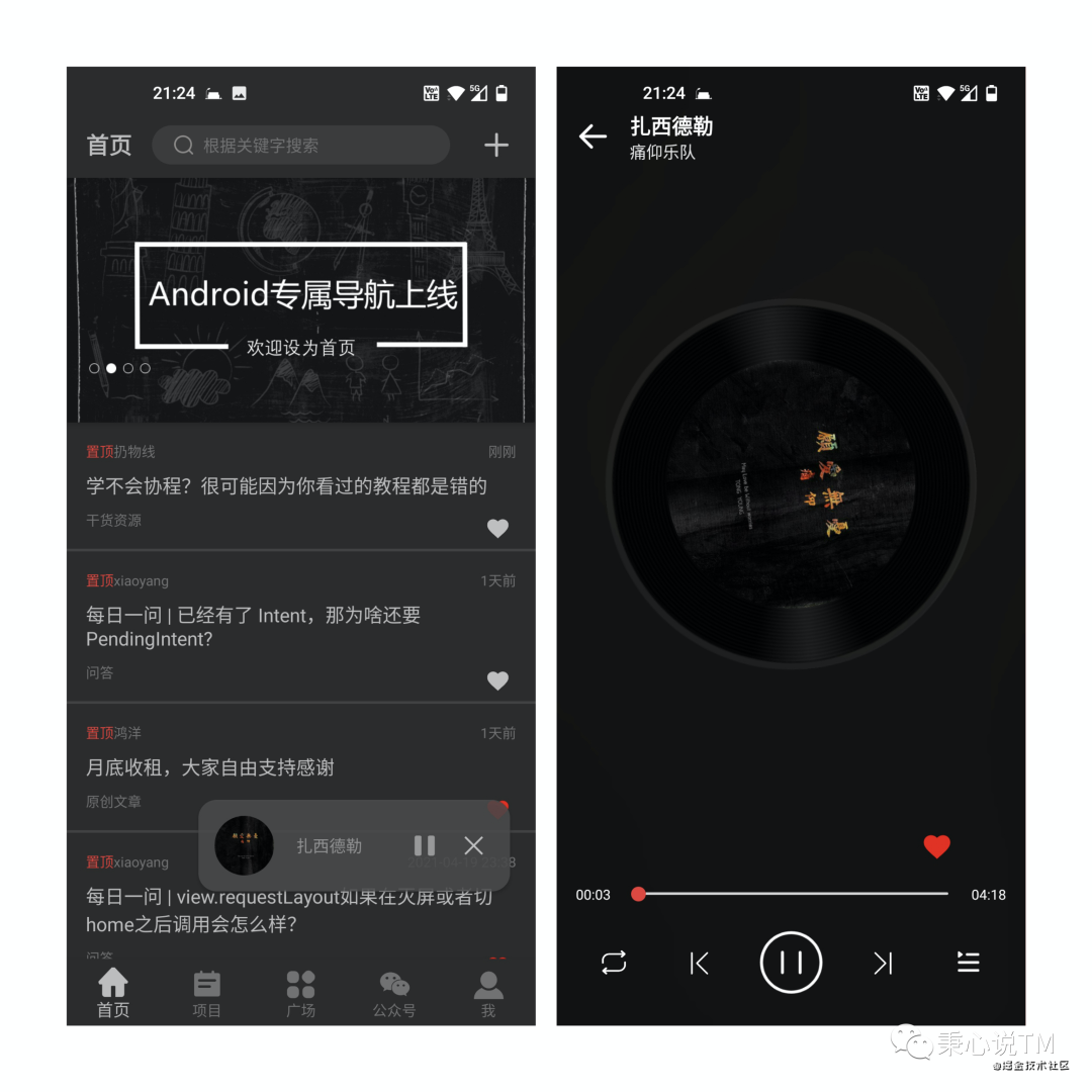 有了ViewModel加LiveData ,Fragment之间可以更优雅的通讯。比如我的开源项目中的音乐播放器(属于单Activity多Fragment架构下),播放页和首页悬浮都包含音乐基本自信,如下图所示: