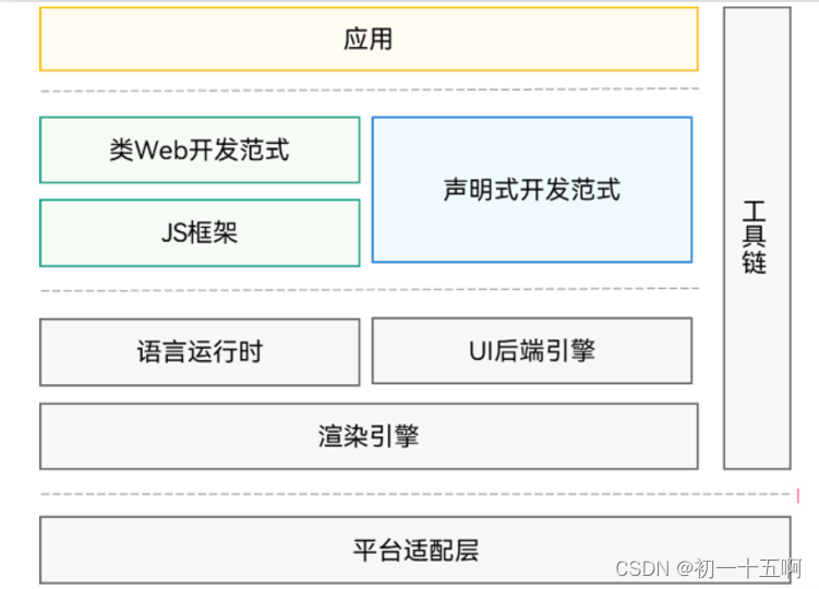 - 应用性能:如下图所示,两种开发范式的UI后端引擎和语言运行时是共用的,但是相比类Web开发范式,声明式开发范式无需JS框架进行页面DOM管理,渲染更新链路更为精简,占用内存更少,应用性能更佳。