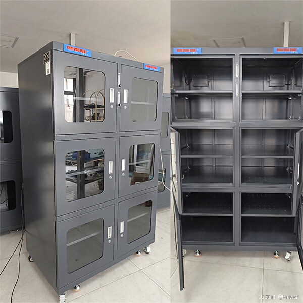 在柜体设计上,不同于普通氮气柜,双三显氮气柜左右有两个流量计镶嵌于柜子中间书档,方便分区调节;两个进气口位于柜子顶部,左右分别接入氮气。用户可以通过电脑或移动设备实时查看柜内的环境数据,并进行相应的设置和调整。