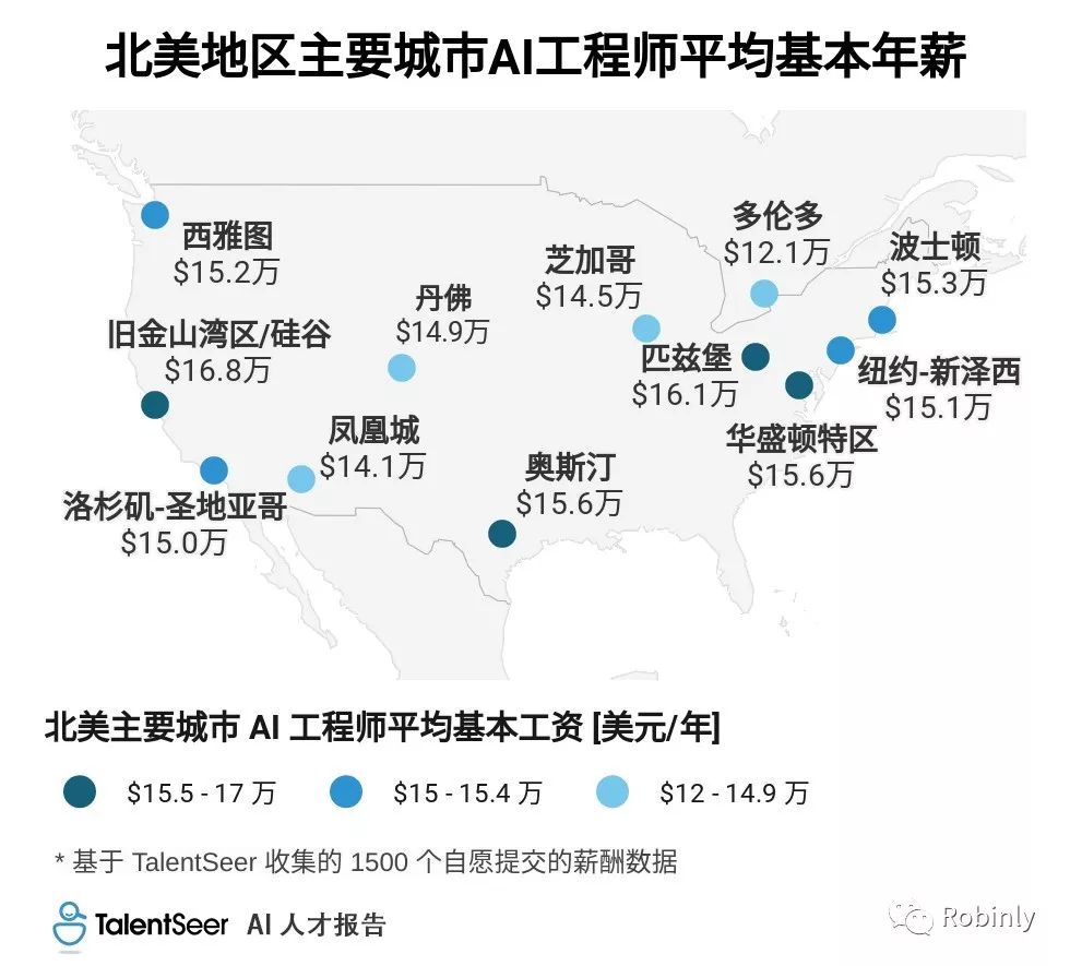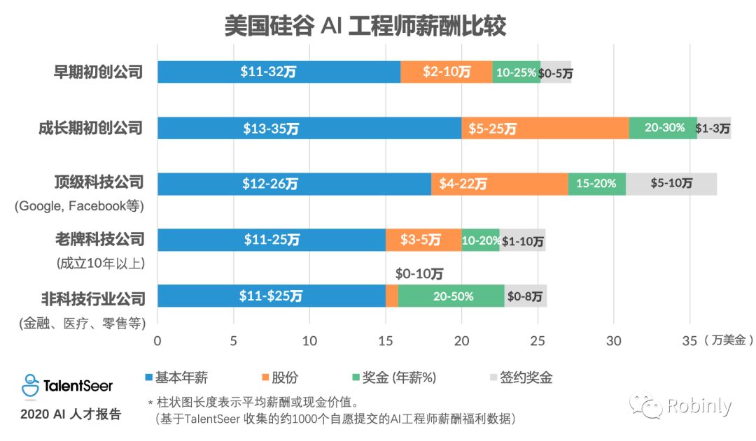 硅谷 AI 工程师薪金稳居北美首位。处于增长期的初创公司基本年薪最高,平均约20万美金。考虑股票、奖金等因素的总薪酬可比肩科技巨头。