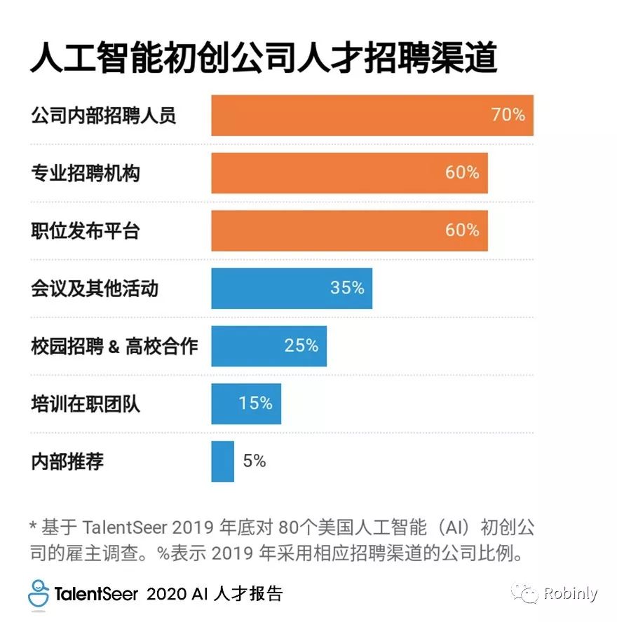 TalentSeer 的雇主调查还显示 25%-35% 的 AI 初创公司会通过学术会议和校园招聘的方式寻找人才。他们表示这两种方式对于初级应聘者比经验丰富的、被动的候选人更为有效。