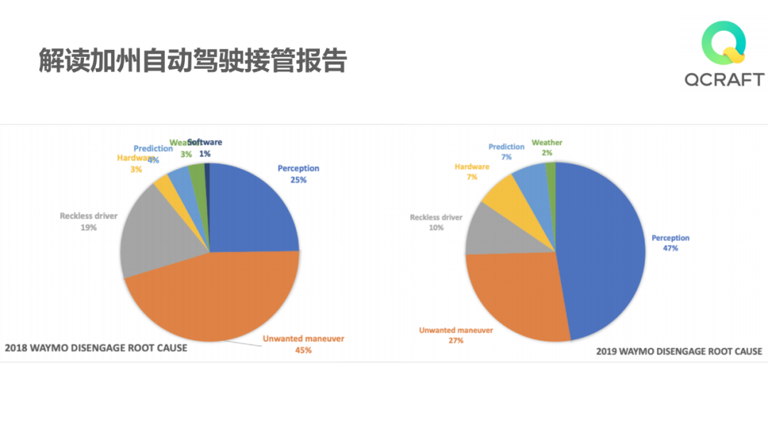 但是,如果把同家公司的接管率在时间维度上进行横向比较就比较有意思了。以总里程数和里程覆盖的多样性都比较受业内认可的 Waymo 为例,当比较 Waymo 在2018年和2019年的接管类型时,可以发现很有意思的一点:感知所占的比例明显变多了,从25%升到了47%。这是不是意味着Waymo 的感知能力下降了呢?并不是。从绝对 MPI 来看,Waymo 无论在感知还是运动规划上都有了进步。从整体比例的变化可以看到,感知占的比例上升,更多是由于规划决策造成接管所占比例下降的缘故。这也意味着Waymo 在规划决策方面有了很大的技术进步,这是非常了不起的,也是和其大规模的仿真测试应用离不开的。