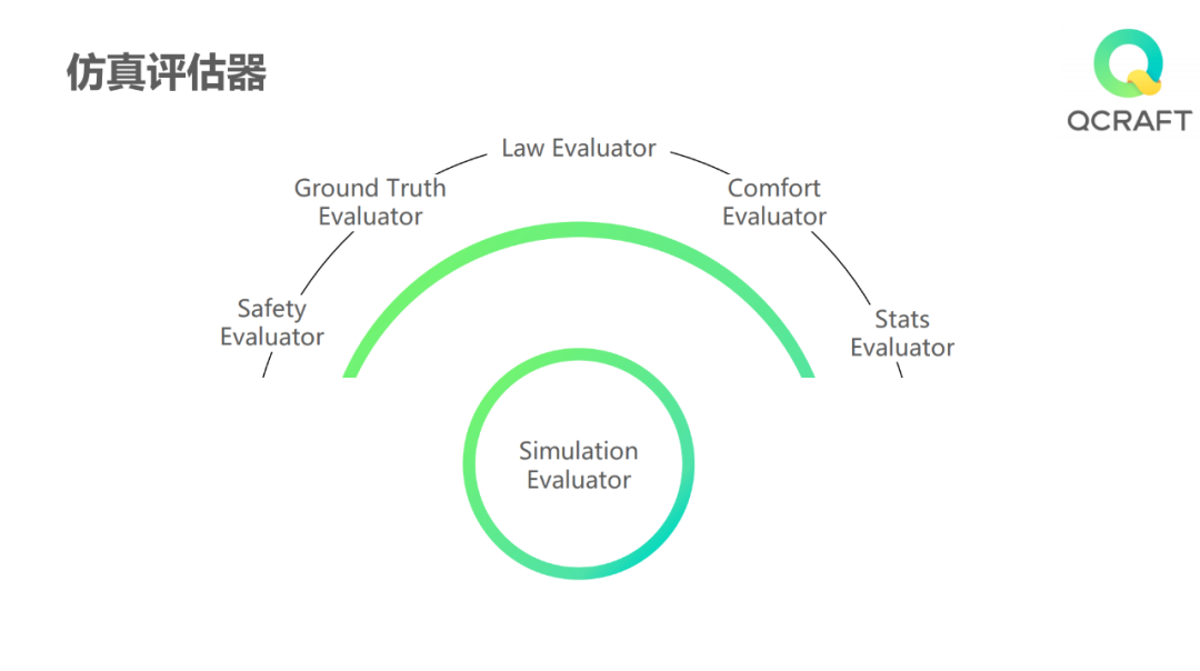 轻舟智航的仿真评估器也可以分为5类:第一类是安全性评估器(Safety Evaluator),包含是否碰撞、是否压到路边、是否撞到行人等评估;第二类是真值评估器(Ground Truth Evaluator),可通过人工标注或自动标注的方式对仿真结果进行检测对比,及时反馈给工程师;第三类是法规评估(Law Evaluator),指的是根据交通规则进行评估,例如是否闯红灯、是否逆行等;第四类是舒适度评估(Comfort Evaluator),指是否有急刹等带来不舒适感的等行为;第五类是状况评估(Stats Evaluator),相对比较底层一些,指根据模块生成的中间结果,进行纵向比较得到评估的结果。