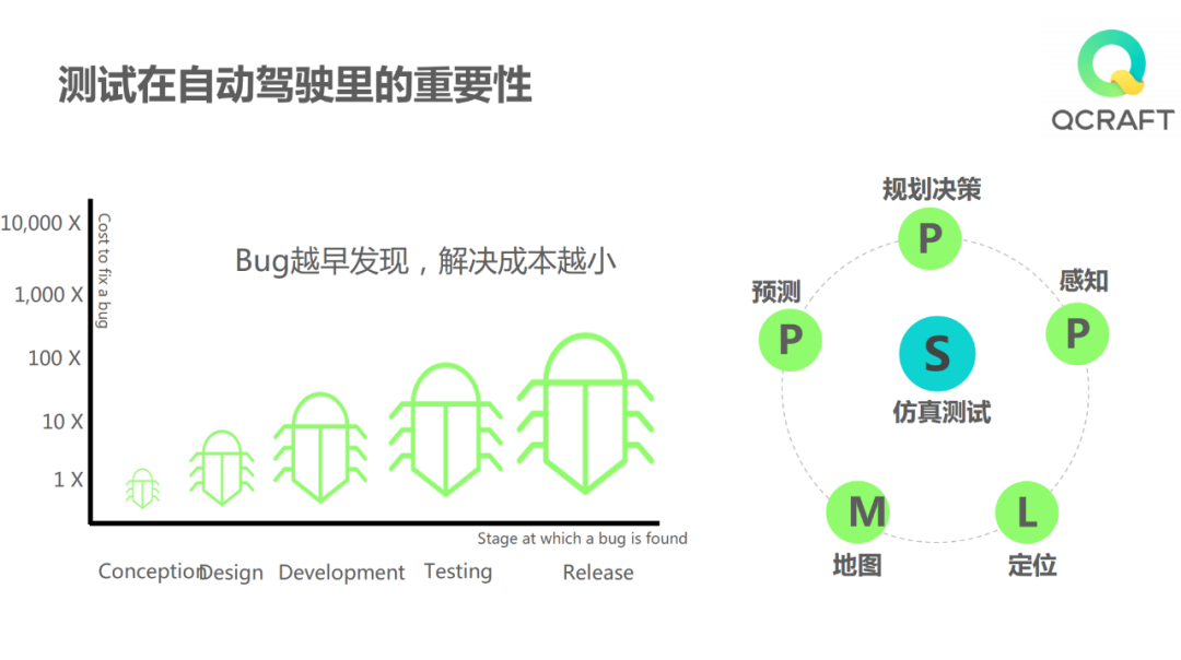 在系统开发和测试中,有一个10x定律,指的是在概念、设计、开发、测试、发布的整个过程中,Bug 每晚一个阶段发现,解决成本就要更高一个数量级。这个10x定律在自动驾驶领域体现尤为明显,问题越晚暴露越难以解决。如果到发布后问题才暴露,那可能就是威胁到生命的灾难。
