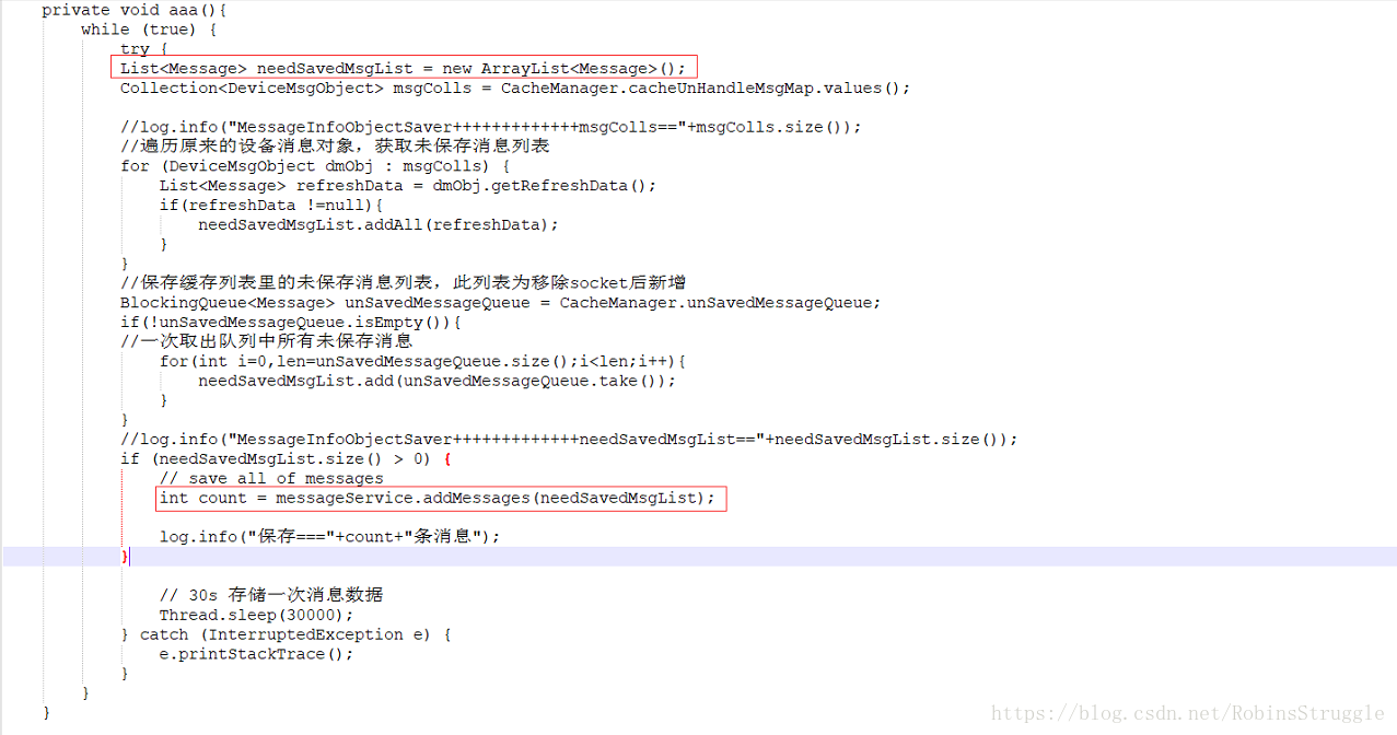 (方法名aaa为自己在notepad++随便写的),从上述代码可以可以看出List<Message>对象一直在循环中被创建,在被使用时里面的数据也没有被清空,由于此处无限循环,且该方法在项目启动时被初始化调用,所以该方法一直未被结束,也就是说创建的无数个List<Message>都未和方法aaa断开连接,导致GC认为这么多List<Message>都是可用资源(附:关于GC对于局部变量的清理的大概机制:一个对象在被new或者被引用到时会和new或者引用的方法建立一个连接,此连接在new这个对象所属的方法结束时断开与此对象的所有连接,当GC在一定时间判断该对象没有连接的时候才会将其清除),所以导致JVM的堆空间一直不断增长,所以导致后内存溢出的问题;