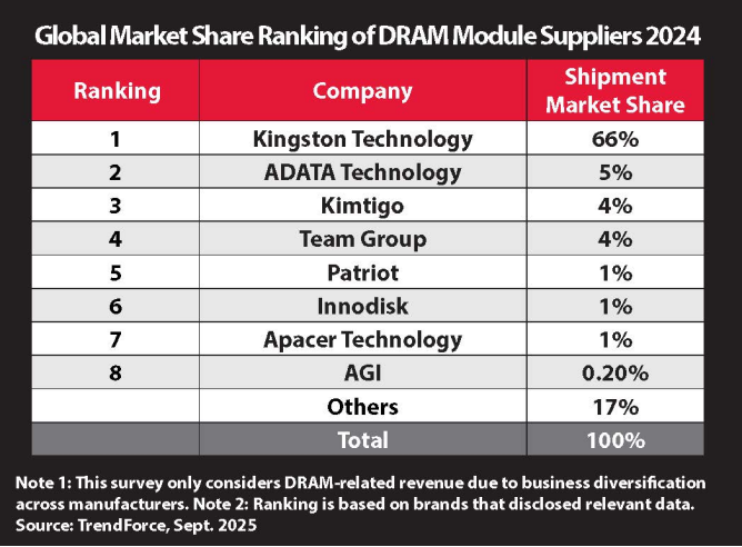 注1:由于制造商业务的多元化,本调查统计数据仅考虑DRAM相关收入;注2:排名基于披露相关数据的品牌。来源:集邦咨询,2025年9月