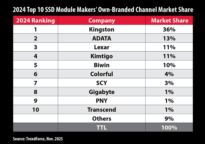 2024年十大固态硬盘模组制造商自有品牌渠道市场份额