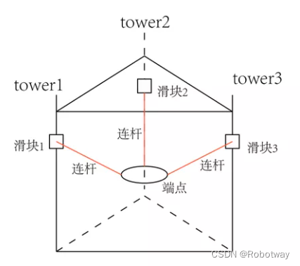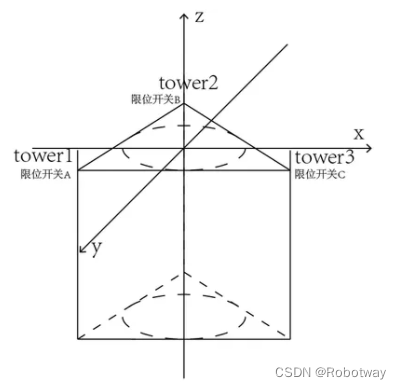 ① 首先我们建立一个空间直角坐标系,该直角坐标系以三个丝杠平台在俯视图方向投影的内切圆心为原点,x轴与tower1和tower3之间的连线平行,y轴过tower2,其中z=0的平面设置在三个限位开关所在平面。