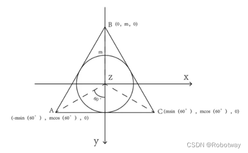 ② 建立坐标系之后,我们可以得出3个限位开关Z轴投影的坐标为A=(-msin(60°),mcos(60°),0);B=(0,m,0);C=(msin(60°),mcos(60°),0);其中m为在xy投影面上正三角形的内切圆心到B点的距离。
