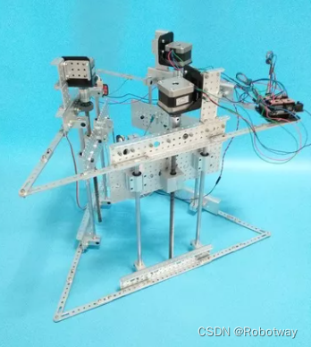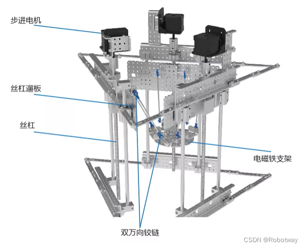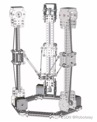 Delta并联机械臂,其驱动系统采用精度较高的42步进电机;传动系统为丝杠和万向球节;执行末端为搭载电磁铁的圆盘支架。
