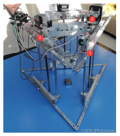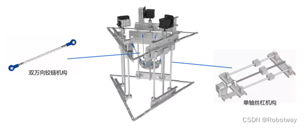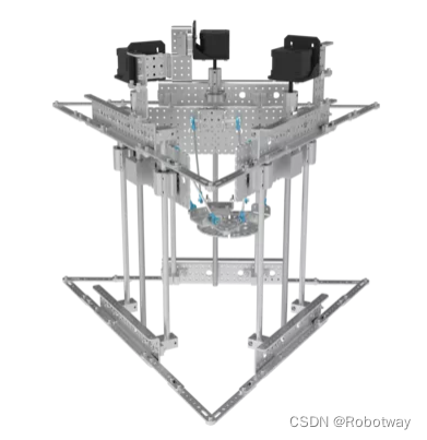 该机械臂由3个丝杠平台构成,通过并联的方式同时控制同一个端点的运动;三个丝杠位于一个正三角形边线的中心位置,连杆采用球头万向节连杆结构。