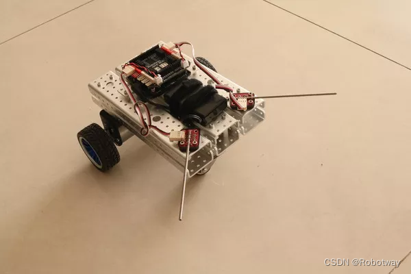 实现思路:机器人小车前进过程中,左边触须传感器触发后,小车右转;右边触须传感器触发后,小车左转;两个传感器同时触发后,小车后退、转弯并前进。