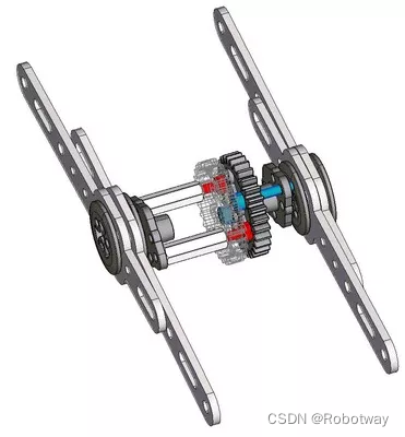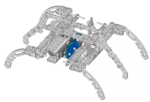 样机由一个圆周舵机带动一个等速齿轮组(下图所示两枚蓝色齿轮),并由随动齿轮带动一个偏心轮连杆机构,从而带动一侧的三条腿。