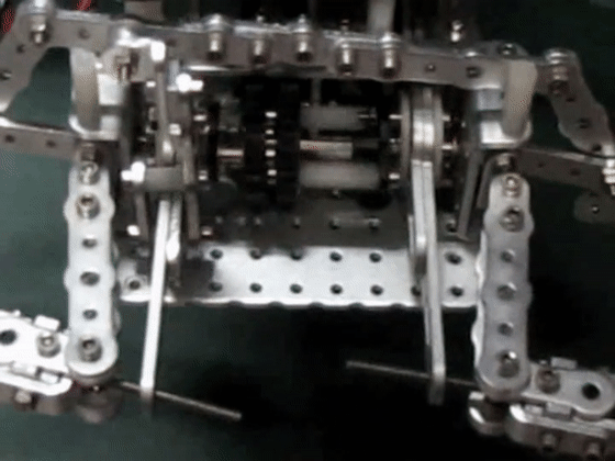 我们把两侧的偏心轮安装成相反的相位(相差180°),当右侧齿轮朝一个放向转动并带动左侧齿轮转动时,两侧的腿就可以做出交替划动、向前爬行的动作。当右侧齿轮反转时,其上的螺丝头要经过约180°的空转才会遇到左侧齿轮的螺丝头,从而自动改变了两侧偏心轮的相位差,将相位调整为接近相同,从而呈现出转向的动作。